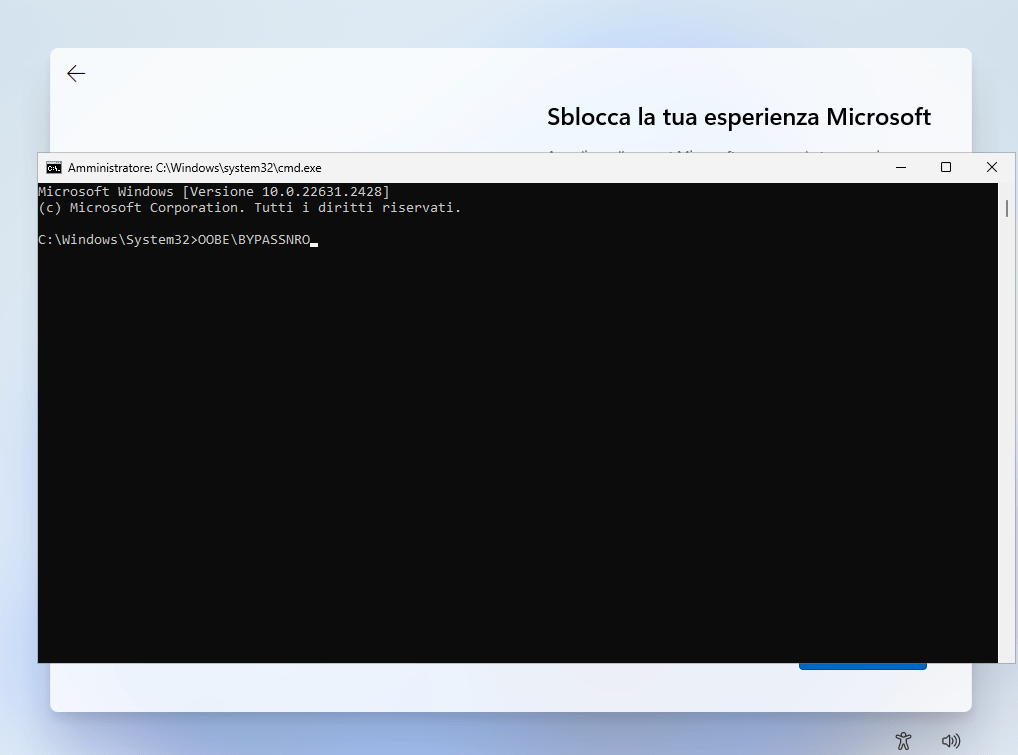 • Digita il seguente comando OOBE\BYPASSNRO e premi Invio: