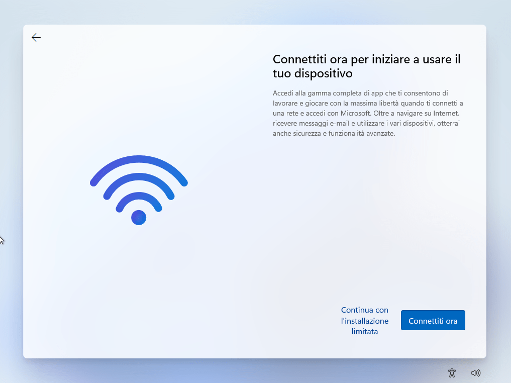 • Dopo aver scelto la lingua e il layout della tastiera, arriverai alla schermata in cui Windows chiede di connettersi a Internet.