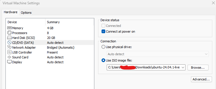 - Scegliere Use ISO image file e caricare la ISO di Ubuntu Server scaricata