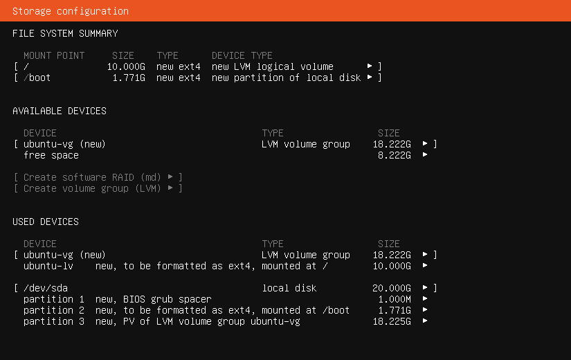 - Il sistema rileverà il disco virtuale da 20 GB e proporrà una configurazione predefinita