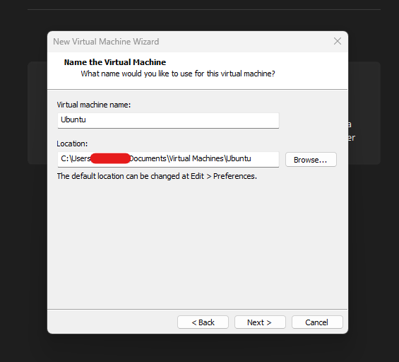 - Dare un nome alla VM e scegliere la posizione di archiviazione (può essere anche un disco esterno per portabilità)