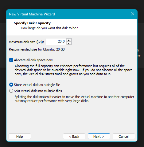 - Scegliere 20 GB (raccomandato).