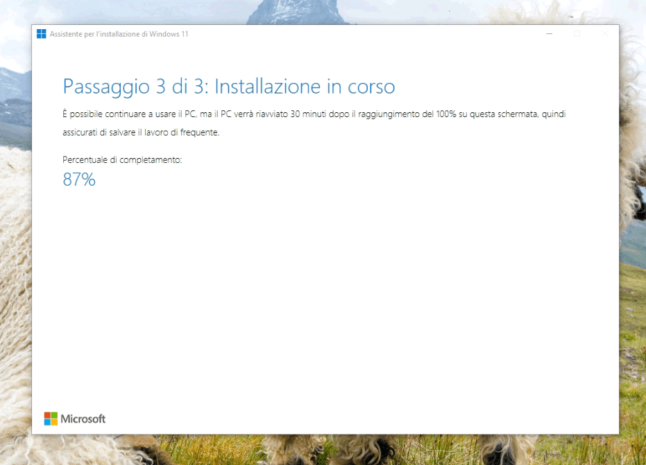 Una volta lanciata l’installazione dall’EXE che avete scaricato vedrete l’avanzamento dell’installazione di windows 11.