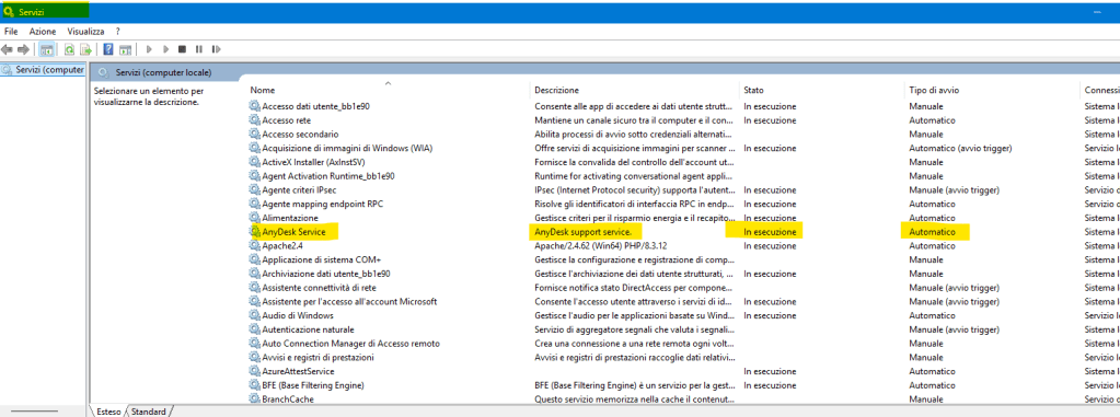 Compare la lista dei servizi e in che stato si trovano, esempio evidenziato, AnyDesk Service In esecuzione , Tipo di avvio automatico, vorrei che non si avvia il servizio e lo disattivo come nelle immagini seguenti.
