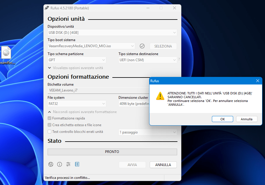 - Avviare la scrittura → in pochi minuti, la chiavetta sarà pronta.