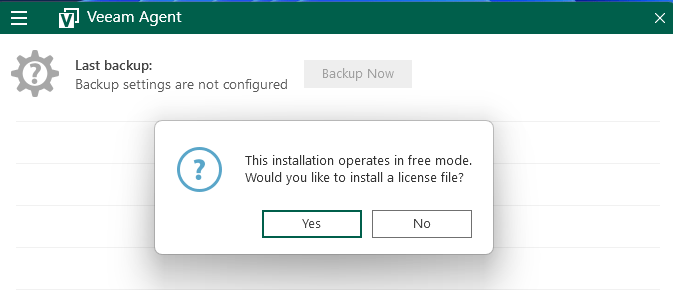 All’apertura, se è la prima esecuzione, ti verrà chiesto se vuoi utilizzare la versione gratuita oppure di aggiungere un license file e/o di creare un nuovo backup job.