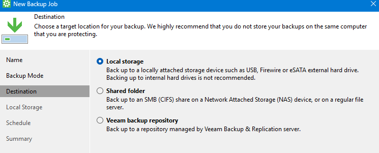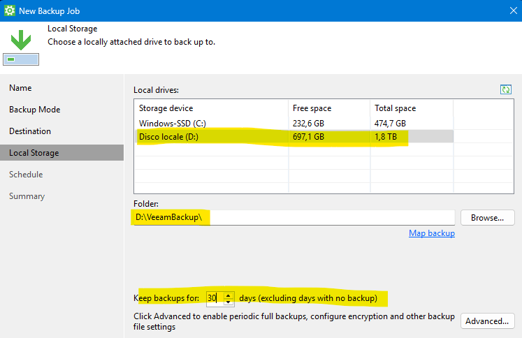 Seleziona la destinazione dove salvare il backup, io ho scelto un disco esterno perchè non ho un NAS o un server di Backup con Veeam (anch’esso scaricabile gratuitamente):