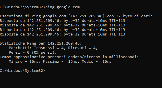 N.B Se viene effettuato il comando ping “ping google.com -t” con finale -t viene effettuato all’infinito, utilie per monitorarlo costantemente mentre risolvere il problema o cambiare regole su un firewall o concedete permessi di varia natura, per fermare il ping infinito si preme ctrl .