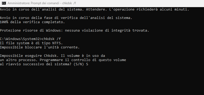 Dopo lanciato il comando, dovrete mettere si il modo che quando viene riavviato il computer esegua il chkdsk all’avvio.