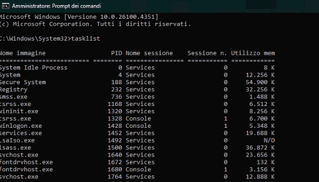 - tasklist e taskkill Il nome è parlante, viene utilizzato per la gestione dei processi attivi come il task manager di windows ma in linea di comando. se per qualche motivo la GUI non funziona potete aprirlo così.