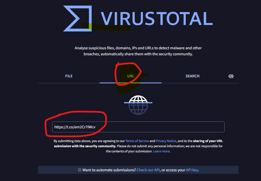 Adesso tornate nella pagina di Virus Total precedentemente aperta, selezionate URL e incollate il link sulla barra e date invio.