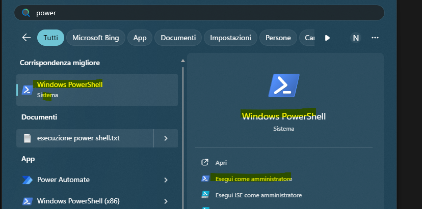 N.B Dovete essere loggati nell’account amministratore altrimenti quando avviate powershell come amministratore e vi trovate in un account user, il percorso farà riferimento al profilo amministratore per facilitare l’operazione.