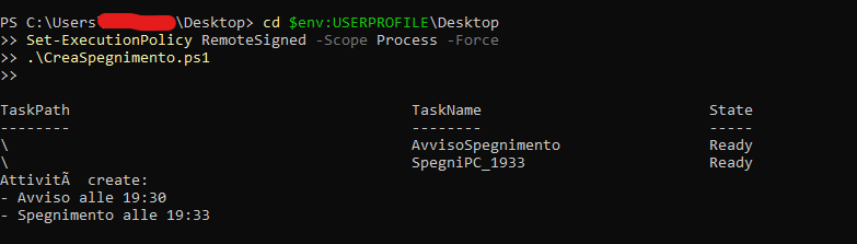 Salva il seguente contenuto in un file chiamato CreaSpegnimento.txt sul Desktop, poi gli cambi l’estensione del file in .ps1