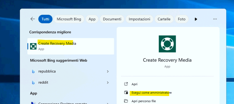 - Aprire Create Recovery Media dal menù start.