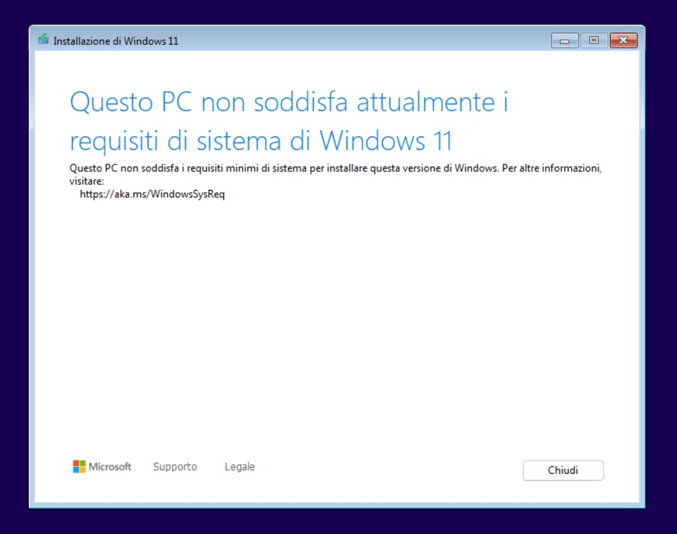 - il sistema potrebbe non ricevere aggiornamenti ufficiali futuri da Microsoft su hardware non supportato