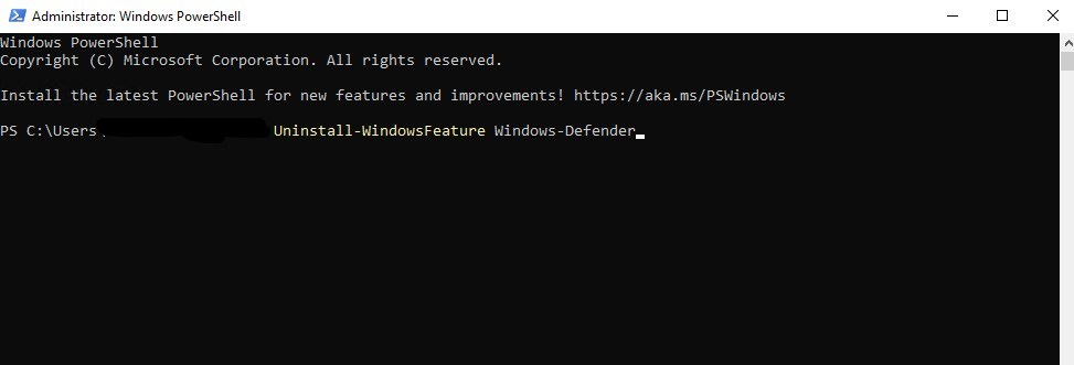 Apri PowerShell come amministratore e manda il comando per disinstallare windows defender.
