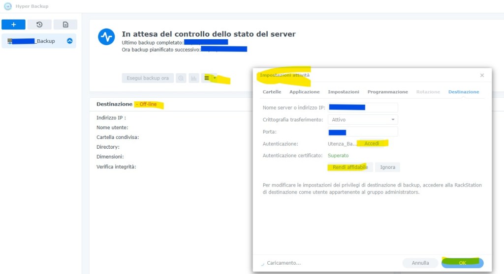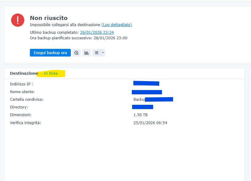 Primo tentativo è un reboot del NAS, ma al riavvio, niente da fare, il Synology non si vede in rete, ma in realtà c’è, mancano i pacchetti Hyper Backup e Hyper Backup Vault in esecuzione.
