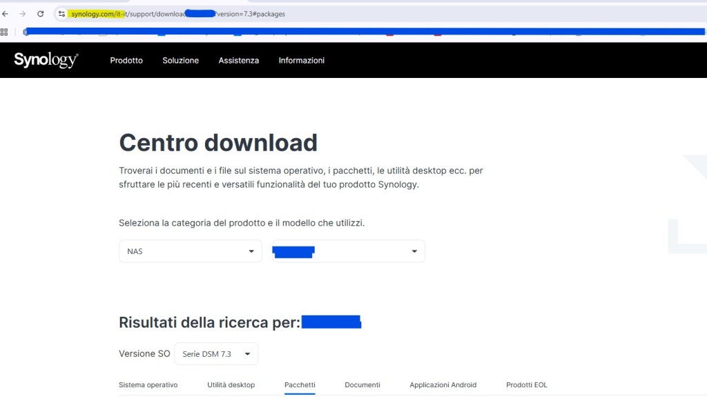 Da qui potrai selezionare il tuo modello di NAS e far uscire tutti i pacchetti e DSM disponibili per il tuo prodotto.