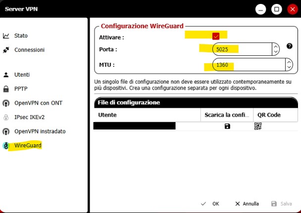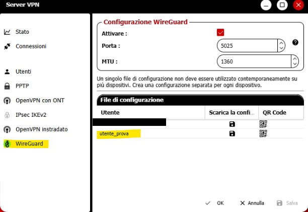 - Dalla sezione WireGuard clicca su QRcode dell’utente che vuoi impostare, apparità un QRcode a schermo.