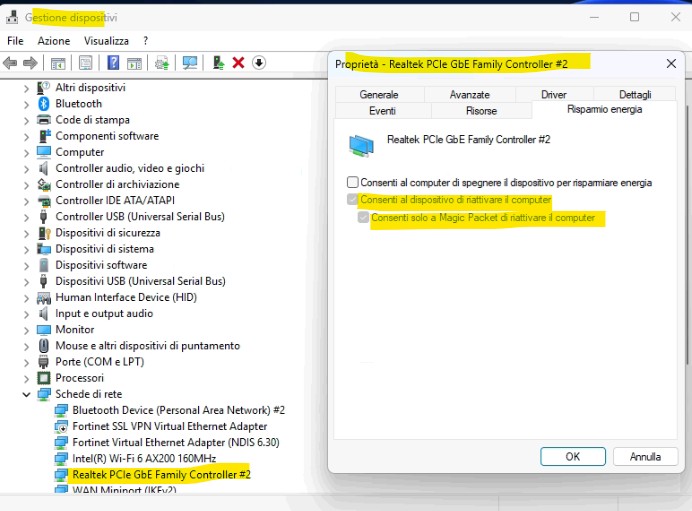 - Verifica WoL abilitato in BIOS + Windows scheda Ethernet → Gestione alimentazione + Avanzate come menzionato prima.
